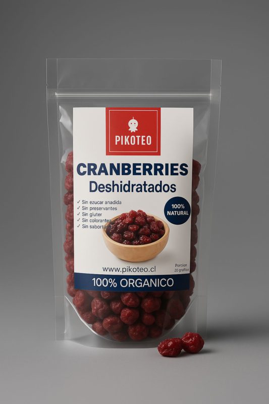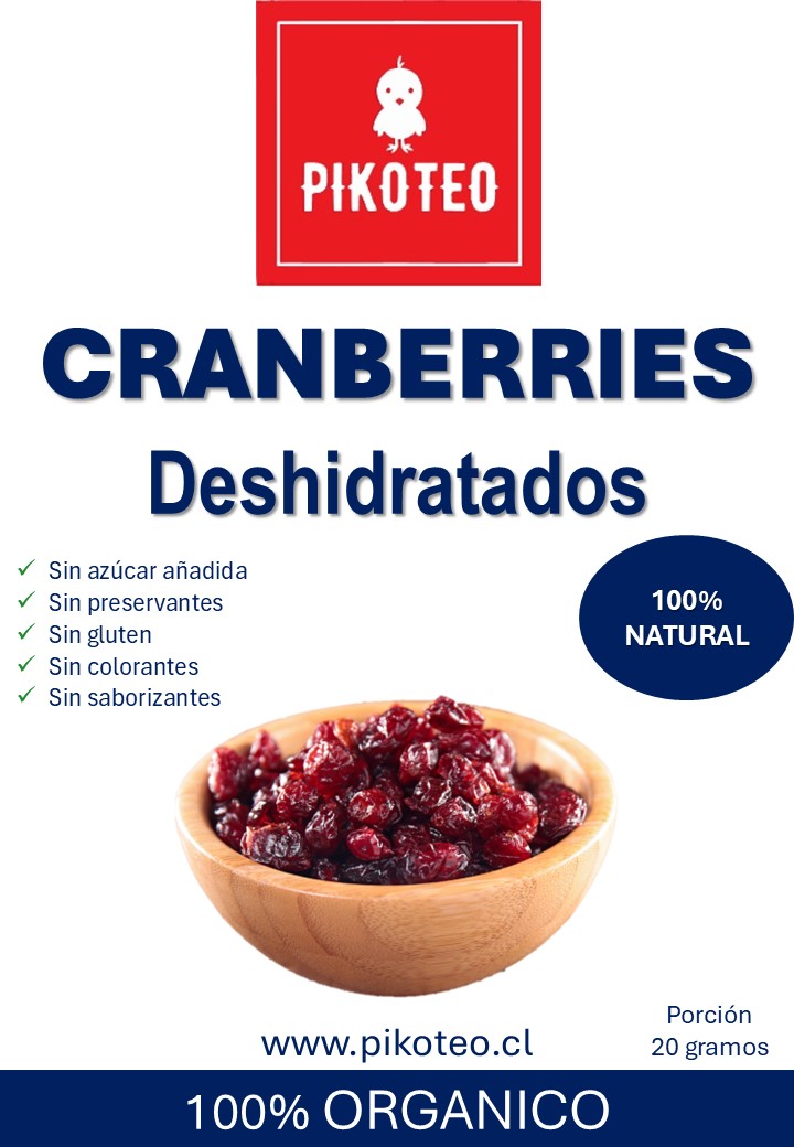Cranberry deshidratado, 100% natural, no contiene preservantes ni aditivos.